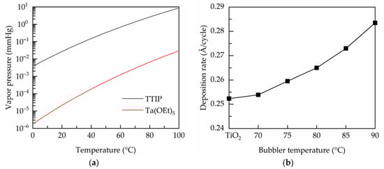 (a) Temperature-dependent vapor pressures of the TTIP and Ta(OEt)5 metal precursors. (b) Deposition rate of the PEALD films prepared at various bubbler temperatures.