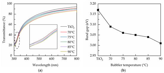 Figure 2a shows the transmittance over a wavelength range from 300 to 800 nm for the PEALD films prepared at various bubbler temperatures. The lower transmittance at the short wavelength region is related to the band-to-band absorption of the TiO2 films. The transmittance decreases with increasing the bubbler temperature, indicating that the increase of Ta concentration enhances the absorption. The reduced transmittance could also be a consequence of the light scattering caused by the oxygen vacancies []. The inset shows the transmittance in the short-wavelength region (300–400 nm) to evaluate the absorption edge. It can be seen that the edge shifts towards longer wavelength direction when the bubbler temperature increases, inferring the reduced band gap. Figure 2b shows the band gap deduced from Tauc’s equation []: