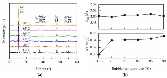 (a) XRD pattern, (b) interplanar distance and FWHM of the PEALD Ta-doped TiO2 films prepared at various bubbler temperatures.