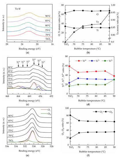Figure 4 shows the composition and chemical states measured by XPS for the PEALD Ta-doped TiO2 films prepared at different bubbler temperatures. Figure 4a shows the high-resolution Ta 4f for the PEALD films, evidencing the Ta incorporation into the TiO2 films. The Ta peaks can be deconvoluted into two Gaussian components at 21.7 and 23.7 eV, corresponding to TaOx (x < 2.5) [].The atomic ratios of the Ti, O, and Ta elements are depicted in Figure 4b. The TiO2 film has an oxygen-deficient structure. The Ta content is varied from 0.82 to 0.95 at.% with increase in bubbler temperature from 70 to 90 °C. The XPS spectra over the biding energy of 450 to 470 eV corresponding to Ti 2p are shown in Figure 4c. The binding energies of around 453–460 eV and 460–466 eV belong to Ti 2p3/2 and Ti 2p1/2, respectively []. Each spin state can further be deconvoluted into Ti4+, Ti3+ and Ti2+ peaks []. The Ti 2p3/2 peaks are analyzed, and the peak ratios of Ti2+, Ti3+ and Ti4+ to total are shown in Figure 4d. The TiO2 has the highest Ti4+ peak ratio of about 60%. At the bubbler temperature of 70 °C, the Ti4+ ratio decreases and Ti3+ ratio increases, indicating that Ta dopants create oxygen vacancies and reduce Ti4+ to Ti3+. At the bubbler temperature of 90 °C, the Ti4+ ratio further reduces and the Ti2+ ratio increases. This result suggests that the higher Ta incorporation causes Ti4+ to reduce to not only Ti3+ but also Ti2+. Figure 4e shows the high-resolution O 1s spectra for the PEALD films. The peaks are further split into two peaks, one at the lower binding energies (530–531 eV) assigned to lattice oxygen and the other at the higher binding energies of 531–532 eV ascribed to oxygen ions in oxygen-deficient regions in the lattice []. The latter is usually deemed to reflect the presence of oxygen vacancies. The ratio of each component to total is calculated as shown in Figure 4f. The lattice oxygen shows an opposite trend to defective oxygen. The increased defective oxygen ratio confirms that the Ta doping leads to the generation of oxygen vacancies defects.