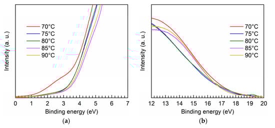 Figure 5 shows the UPS spectra for the PEALD Ta-doped TiO2 films prepared at different bubbler temperatures. As shown in Figure 5a, the extrapolation of the linear region of the curves to the binding energy axis gives the maximum valance band energy (EVBM) with respective to the Fermi energy. The curves in the high binding energy region are shown in Figure 5b, and similarly, the extrapolation of the linear region of the curves to the x-axis corresponds to the cut-off energy (Ecutoff). Accordingly, the positions of Fermi level (EF) and valance band (Ev) can be calculated as given by []: