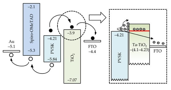 Isolated energy band diagram of each material involved in a TiO2 ETL-based PSC. The inset indicates the interfaces of perovskite/TiO2 and perovskite/Ta-doped TiO2 ETL.