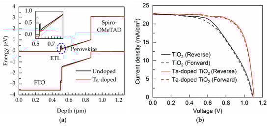 Figure 8a shows the band-bending of energy levels in the PSCs with undoped TiO2 and Ta-doped TiO2 ETL deposited at the bubbler temperature of 85 °C. The major difference is at the ETL/perovskite interface. A conduction band barrier is clearly presented at the undoped TiO2/perovskite absorber interface; however, the barrier disappears in the case of using Ta-doped TiO2 ETL due to the very little conduction band mismatch. This is expected to be reflected on the improvement in FF of the devices. In addition, as shown in the inset, the slope of the conduction band of the Ta-doped TiO2 device is steeper than that of undoped TiO2 device, and this implies a greater built-in electric field, which could enhance the separation of photo-generated electron-hole pairs. The J–V characteristics of the fabricated PSCs in the forward and reverse scans are shown in Figure 8b, and the corresponded external photovoltaic parameters are listed in Table 3. Apart from the slightly improved Voc and Jsc, the cell with the Ta-doped TiO2 ETL has a considerably enhanced FF. The SEM images of the PEALD TiO2 and Ta-doped TiO2 films are shown in Figure S1. The two samples are compact without observable pinholes, and do not show much difference in surface morphology likely due to the low-Ta doping level. It is believed that the FF improvement of the perovskite solar cells with the Ta-doped TiO2 ETL is due to the reduction of the conduction band mismatch, thereby decreasing the transport barrier of electrons. This demonstrates the significance of the conduction band alignment of the ETL. In addition to the absence of the transport barrier at perovskite/ETL interface, the improved FF of the device with the Ta-doped TiO2 ETL is partially owing to the smaller series resistance as assessed from the inverse slope of the J–V curves at the Voc-point. The hysteresis index of the PSCs is investigated, which is given as []:
