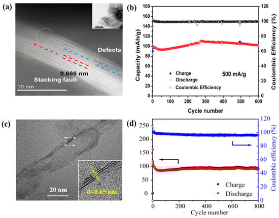 Xu et al. applied defect engineering to prepare defect-rich MoS2 nanosheets via a facile hydrothermal process accompanied by heat treatment []. The introduction of defects into nanomaterials can be promising strategies because they can store more foreign ions and enhance the electrochemical performance of these batteries. From many theoretical predictions, researchers have found that defects can increase the active sites in the electrode. The presence of defects increases the surface energy of the electrode and provides new active sites, which promotes the ion adsorption and increase the capacity. Numerous edge sites and vacancies were created in these nanosheets in a controlled manner. Indeed, these defects facilitated the diffusion of Zn2+ and significantly improved the reversibility of the activated MoS2 as compared to its pristine counterpart. Additionally, the defects in MoS2 could increase its interaction with Zn2+, and at the same time, could extend its interlayer distance. Figure 6a shows the (100) plane stacking fault and disordered atomic disposition on the surface of the material. The inefficient plane stacking resulted in a significant increase in the edge spacing and a slightly increased interlayer distance (0.686 nm). In addition, a disturbance of the atoms caused cracking of the planes, leading to the formation of additional edges. The defect-rich MoS2 accelerated the diffusion of Zn2+ owing to the formation of new transport pathways at the numerous edges and defects. As a result, a satisfactory discharge capacity of 102.4 mAh g−1 was obtained after 600 cycles at 500 mA g−1, demonstrating the promising energy storage ability of MoS2 (Figure 6b). Yang et al. reported novel MoS2 nanosheets with a porous tubular structure prepared via template-assisted thermal decomposition []. As can be observed from the transmission electron microscopy (TEM) image (Figure 6c), the MoS2 nanotube exhibited a layered structure with a interlayer distance of 0.65 nm. The tubular MoS2 showed the following merits for Zn2+ diffusion: (i) the formation of voids in the structure of the MoS2 nanosheets (the ratio of Mo and S atoms of 1:1.4) improved its ability to accommodate Zn2+; (ii) the tubular structure of the MoS2 nanosheets enhanced their electrolyte uptake and ion diffusion, which facilitated electron transport during the charge/discharge process. Thus, the novel MoS2 nanosheets exhibited a good discharge capacity of 146.2 mAh g−1 at 200 mA g−1 and excellent cycling performance with 74.0% capacity retention after 800 cycles.