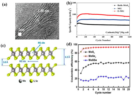 Yang et al. carried out first-principle studies and proposed MoS2 with a zigzag structure as a favorable cathode for rechargeable MIBs []. This study showed the detailed diffusion pathways for Mg2+ in the MoS2 nanoribbons. The specific diffusion path of Mg2+ was shown to be through a nearest-neighbor H site in a zigzag manner between two adjacent T sites in MoS2. This pathway in the MoS2 nanoribbons was different from the conventional pathways of graphene nanoribbons, where Mg2+ ions undergo hopping between the intralayer hollow sites across the C–C bridge. The maximum theoretical capacity of a MoS2 nanoribbon (width of 5 nm) that can accommodate six Mg atoms was predicted to be 232.2 mAh g−1. Liang et al. synthesized highly exfoliated, graphene-like MoS2 (G-MoS2) as a cathode material for MIBs through a solvothermal process []. The synthesis of G-MoS2 was from solvothermal reaction between MoO3 and thioacetamide with pyridine as a solvent. The nature of few layer MoS2 was confirmed by XRD which showed significantly reduced intensity of (002) peak for G-MoS2 compared with bulk-MoS2 (B-MoS2). In addition, the interlayer distance of the prepared G-MoS2 was 0.65–0.70 nm, which is larger than that of B-MoS2 (0.63 nm) (Figure 8a). Apart from cathode side, the anode part was also studied; the ultra-small Mg nanoparticles (N-Mg, diameter of ~2.5 nm) was prepared by ionic liquid-assisted chemical reduction and compared with bulk Mg (B-Mg). The full cell performance of four different cells (G-MoS2/N-Mg, G-MoS2/B-Mg, B-MoS2/N-Mg, and B-MoS2/B-Mg) was systematically compared (Figure 8b). The results showed significantly improved cyclic performance for G-MoS2/N-Mg cell in terms of specific capacity and cyclic stability. The measured Mg storage capacity of MoS2 was estimated to be 170 mAh g−1 after 50 cycles. It was noted that this capacity was 24% lower than its theoretical capacity (232.2 mAh g−1), which probably originated in the partial restacking of the MoS2 layers and the intercalation of Mg only on one side of the MoS2 layer. The high performance of G-MoS2/N-Mg cell was attributed to the reduction in the passive film on the surface of N-Mg that increases the diffusion coefficient and increased available intercalation sites in g-MoS2. Liu et al. fabricated MoS2/C microspheres with a sandwich structure via a hydrothermal process and heat treatment []. The carbon formed by the hydrothermal glucose carbonization improved the ionic conductance and extended the interlayer spacing, facilitating the diffusion of Mg2+ and making the process reversible. In addition, the graphene-like MoS2/C structure promoted the access of Mg2+ ions to the electrolyte, facilitating Mg2+ transport. As a result, the sandwiched MoS2/C delivered a discharge capacity of 118.8 mAh g−1 after 20 cycles at 50 mA g−1 and exhibited excellent cycling stability as compared to bulk MoS2. Truong et al. reported the rapid exfoliation of MoS2 and molybdenum diselenide (MoSe2) nanosheets using the supercritical fluid (SCF) method []. SCF exfoliation is a facile and fast process used to produce high-quality TMD nanosheets (few-layer). They applied this process to MoS2 and MoSe2 and obtained few-layer (1–10 layers) nanosheets with hexagonal structures (2H stacking sequence). The structure was precisely observed using atomic-resolution high-angle annular dark-field imaging. When used as MIB electrodes, the MoS2 and MoSe2 nanosheets delivered the specific capacities of 81 mAh g−1 after 10 cycles and 55 mAh g−1 after five cycles at 0.02 A g−1, respectively, which are superior to those of pristine MoS2 and MoSe2.