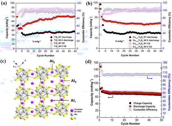 Cyclic performance of (a) TiS2 and (b) Cu0.31Ti2S4 at room temperature and 50 °C at 5 mA g−1. Reprinted with permission from Geng et al. [] Copyright 2017, American Chemical Society. (c) Schematic structure of Al insertion sites in Mo6S8, (d) cyclic performance of Mo6S8. Reprinted with permission from Geng et al. [] Copyright 2015, American Chemical Society.
