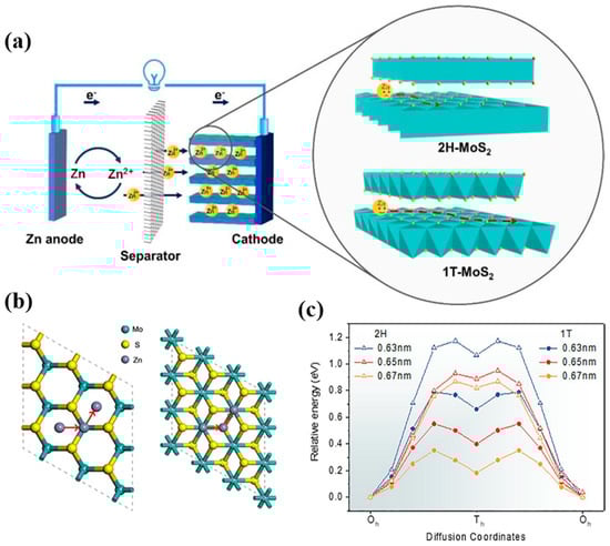 As a representative TMD, MoS2 possesses different structural stages depending on the metal coordination geometry, properties, and stacking order. For instance, bulk MoS2 has two different phases: the 2H phase with a triangular prismatic coordinated geometry (bandgap of 1.3 eV) and the 1T phase with an octahedral coordination between Mo and S atoms (metallic properties), as shown in Figure 14a [,,]. The ionic conductivity of the 1T MoS2 phase is much larger than that of the 2H MoS2 phase [,,]. The different phases of MoS2 affect its electrochemical performance. For example, the phase engineering of MoS2 has been demonstrated to be an effective strategy for modifying its catalytic capacity [,,,]. Because of the different atomic and electronic structures of the hydrophobic 2H and hydrophilic 1T phases, the different concentrations of the two phases in MoS2 can significantly affect the adsorption sites and diffusion pathways for Zn2+ ions in rechargeable aqueous ZIBs (Figure 14b). Liu et al. proposed an effective method to produce MoS2 nanosheets with different phase contents through phase modification []. The MoS2 nanosheets with a high 1T phase content (~70%) showed better specific capacity and cycling performance in ZIBs than those with the 2H phase. In addition, as the distance between the interlayers increased, the diffusion energy barrier of Zn also decreased (Figure 14c).