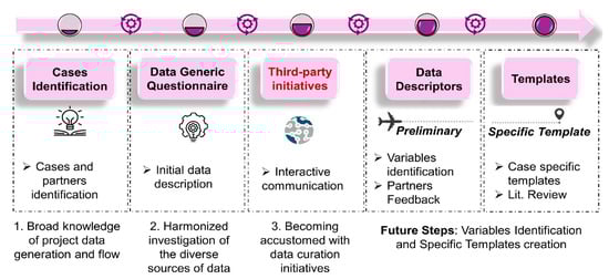 The next step includes the identification of data descriptors that define the variables of interest based on the partners’ initial feedback to the questionnaire. The preliminary template is created and circulated among the relevant partners to collect additional feedback regarding the dataset (see Section 3.4).