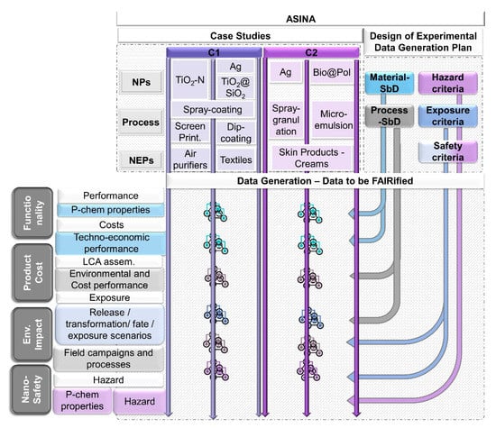 An initial screening of the experimental/computational objectives suggests the creation of diverse datasets to capture different phases of the NPs/NEP life cycle. However, from Figure 2, the following information pillars are distinct: (1) functionality, which includes details of p-chem characterization coupled with life cycle costing performance indicators; (2) nanosafety (hazard analysis and exposure information across the life cycle); (3) product cost (techno-economic indicators and costs performance) derived from a life cycle assessment; (4) environmental impact derived from exposure assessment and scenarios and environmental toxicological studies. In each pillar, several partners with different stakeholder roles and expertise across different organizations and institutions are involved.