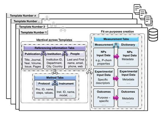 An Excel CEINT-NIKC template with seven spreadsheet tabs, including publication, institution, people, measurement, protocol, instrument and dictionary, is shown in Figure 3, and was selected to be used in ASINA to capture information regarding the data. These seven tabs are separated into three broad categories: reference information, measurement, and method. Information and examples regarding the structure of the template can be found here (https://wiki.nci.nih.gov/display/ICR/ISA-TAB-Nano+Curated+Examples, accessed on 1 May 2021).
