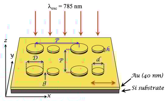 Design scheme of the Au/Si asymmetric dimer array on gold film (thickness = 40 nm) with all the paramaters of nanodimers: D = 130 nm, d = 65 nm, P = 300 nm, g = 10 nm and h = 40 nm (Si+Au). The red arrows correspond to the illumination by a laser at 785 nm under normal incidence, and at the bottom right, the double red arrow corresponds to the polarization direction of the laser oriented along the dimer axis.