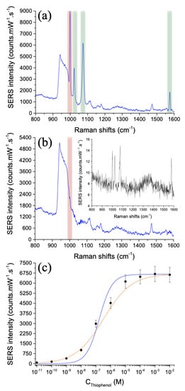 where , I, and have the same correspondence than with the Langmuir model. k represents the concentration of molecules generating half coverage, and n the Hill coefficient. A nice agreement is achieved between the experimental results and the fitting curve using the Hill Equation (see the orange curve in Figure 4c), where the values of k and n are extracted and equal to 3.3 × 10 M and 0.46, respectively. This value of k = 3.3 × 10 M confirms the high affinity of thiophenol molecules towards the gold surface. However, the value n = 0.46 is inferior to 1 indicating that thiophenol molecules already bound to the gold surface reduces the affinity of the incoming molecules to this surface [55].