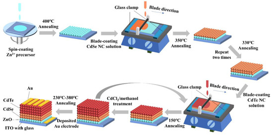 The Zn2+ precursor, CdSe and CdTe NCs were prepared based on the methods reported in [26]. The CdSe NCs were dissolved in pyridine with a concentration of 30 mg/mL, while CdTe NCs were dispersed into a pyridine/n-propanol (with volume ratio of 1:1) solvent with a concentration of 40 mg/mL. In the first step, the ZnO thin film with a thickness of ~40 nm was prepared by spin casting Zn2+ precursor on ITO substrate followed by an annealing process of 400 °C for 10 min, as described in [27]. After that, CdSe and CdTe NC films were deposited on the ITO/ZnO substrate in sequence by the blade coating method, as shown in Figure 1. During the blade coating process, several drops of CdSe NC solution were put onto the ITO/ZnO substrate and blade coated evenly using a 10-micron wire rod at a speed of 150 mm/min. Then the substrate was transferred to a hot plate and annealed at 150 °C for 10 min and 350 °C for 40 s to eliminate any organic solvent and impurities. Two or more layers of CdSe NC thin film were fabricated by repeating the above process. The thickness of each layer was about 45 nm. The ITO/ZnO/CdSe substrates were then soaked in methanol and washed ultrasonically. After drying in a N2 flow, the CdTe NC thin film was then blade coated on the ITO/ZnO/CdSe substrate at a speed of 150 mm/min. The sample ITO/ZnO/CdSe/CdTe was then placed on a hotplate at 150 °C for 3 min, followed by immediate dipping into saturated CdCl2/methanol solution for 10 s and rinsed in 1-propanol for 3 s to remove excess CdCl2. The sample was then placed on a hot plate at 350 °C for 40 s and cooled down to room temperature. This process was repeated several times to obtain CdTe NC thin films with different thicknesses (Figure S1 shows the blade coating device). The thickness of each single layer of the CdTe NC was around 110 nm. Finally, the samples were dipped into a saturated CdCl2/methanol solution for 3 s and placed on a hot plate at 230~380 °C for 25 min to increase the crystallinity of the CdTe NC thin film. After cleaning in methanol solution, 80 nm Au was then deposited on the ITO/ZnO/CdSe/CdTe through a shadow mask by vacuum thermal evaporation. The final solar cells with areas of 0.16, 0.3, and 0.5 cm2 were achieved by using different shadow masks (Figure S2).