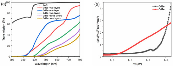 (a) Transmission spectra of different ZnO, CdSe NC thin films and CdTe NC thin films with different thicknesses; (b) the plots of (αhv)2 versus photon energy (hv) of the CdSe and CdTe NC thin films.