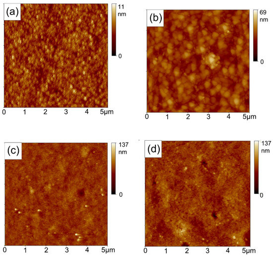 The morphologies of ITO/ZnO, ITO/ZnO/CdSe, and ITO/ZnO/CdSe/CdTe with different annealing temperatures are presented in Figure 3. It is obvious that the ZnO and CdSe NC thin films were very smooth and compact with root mean square (RMS) roughness values of 1.03 and 5.46 nm, respectively (Figure 3a,b). The morphology of the CdTe NC thin film was affected by the annealing temperature. The RMS roughness value of the CdTe NC films with annealing temperatures of 250, 290, 310, and 380 °C were 6.74, 9.39, 10.5, and 13.1 nm, respectively (Figure 3c–f). This suggests that the blade coated CdTe NC thin films are homogeneous and annealing temperature does not have a significant influence on the roughness of the thin film. A smooth CdTe NC thin film is essential to eliminate interface recombination and increase carrier collection efficiency. Besides, it should be noted that there are some pinholes for the NC samples treated under high annealing temperature (Figure 3f), which may result in large leakage current. From this point of view, a high annealing temperature is not recommended for the post-treatment of our NC solar cells.
