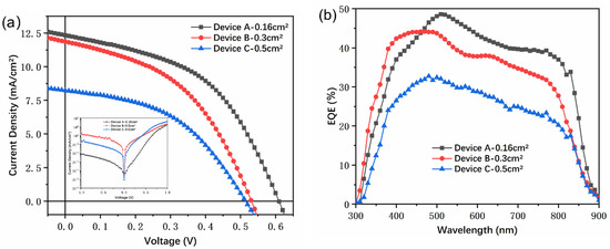 (a) J–V curves of ITO/ZnO/CdSe/CdTe/Au with different active areas (Device A—0.16 cm2, Device B—0.3 cm2, Device C—0.5 cm2) under light (inset is J–V under dark); (b) the corresponding external quantum efficiency (EQE) spectrum.