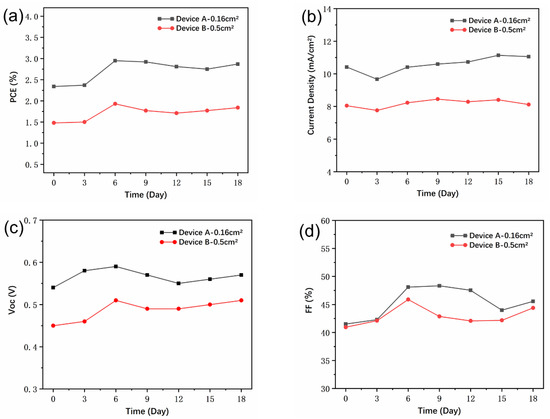 Evolution of parameters (a) PCE (power conversion efficiency), (b) , (c) , and (d) FF for devices with different active areas stored under ambient conditions (Device A—0.16 cm2, Device B—0.5 cm2).