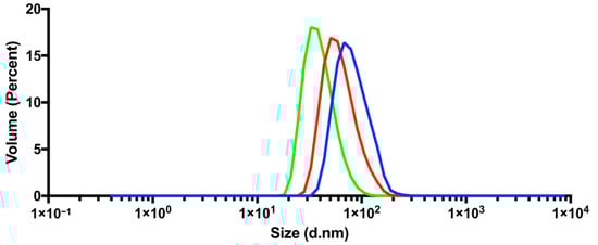 DLS results for MCPs (green), MCP-PEG10K (red) and MCP-PEG10K2 (blue). Graphs represent mean of 6 volume measurements. (For size distribution by intensity and DLS results of MCP, MCP-PEG5K, MCP-PEG10K, MCP-PEG10K2 and MCP-PEG20K please see supplement Figures S1–S3).