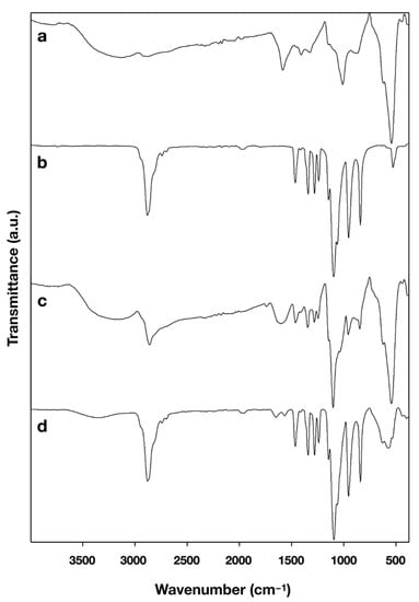 (a–d). FTIR spectra of (a) MCP, (b) mPEG-amine10K, (c) MCP-PEG10K and (d) MCP-PEG10K2. For a list of the characteristic FTIR absorption bands and their assignment please see supplement Tables S4–S7.