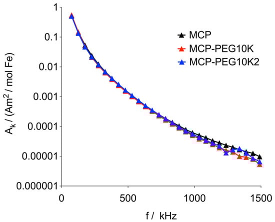 The MNPs were also measured by MPS, which can be regarded as a zero-dimensional MPI scanner without spatial resolution [42]. The amplitudes of the harmonics, normalized to the iron amount in the sample, of the pegylated and doubly pegylated MCPs at 12 mT and 25 kHz were almost identical, indicating that pegylation has no significant influence on the dynamic magnetic properties of the core structure (Figure 5). Conversely, for MCP-PEG5K, the amplitudes of the harmonics were significantly reduced (for MPS data of MCP-PEG5K, please see supplement Figure S5). This might have been caused by partial MNP aggregation during the synthesis process or by the presumably insufficient stabilizing effect of the 5kD peg chains. The large magnetic core diameters of MCPs need effective stabilization to prevent aggregation [25]. Once aggregated, the relatively large magnetic moments of the MCPs interact within an aggregate via a dipole–dipole interaction, that often slows down the dynamics of the moments [43]. If the subsequently increased lag of the moment behind the excitation field is large enough, the MPS amplitude decreases.