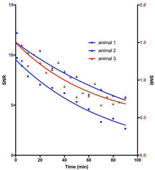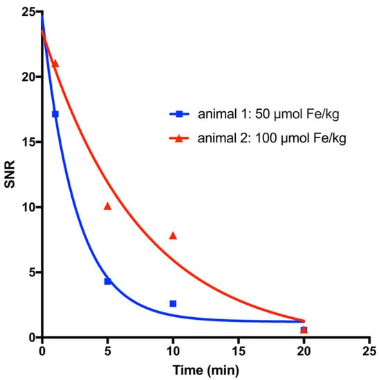 For a first evaluation of the blood half-life of MCP-PEG10K, MNPs were administered into the tail vein of two rats at doses of 50 and 100 µmol Fe/kg. The rats were then examined in a 1.5 Tesla MRI scanner to measure transient intravascular signal enhancement over time. The blood half-life of MCP-PEG10K was 1.8 and 5.2 min at 50 and 100 µmol Fe/kg, respectively (Figure 7). The half-life was significantly reduced compared to similar MCPs without pegylation, for which 8.8 and 17.4 min at 50 and 100 µmol Fe/kg have been reported [25]. Based on these results, we synthesized MCP-PEG10K2 by a second reaction of MCP-PEG10K with mPEG-amine10K to further increase the PEG density on the MCPs surfaces.