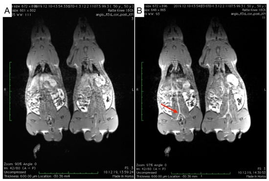 T1-weighted MR images of 2 male Sprague Dawley rats before (A) and 20 min after administration (B) of MCP-PEG10K2 (50 µmol Fe/kg). The red arrow in B indicates the area where signal enhancement was measured to determine the blood half-life of MCP-PEG10K2.