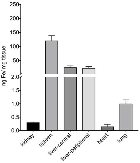 MR images of the rats acquired after 24 h were assessed for visual qualitative determination of MNP organ distribution. The results indicate that MNPs are mainly taken up in the liver and spleen [51]. Afterwards, the rats were euthanized and the organs were removed, cut into small pieces, and the MNP content was quantified by MPS. The highest concentrations of MNPs were found in the spleen and liver and only very low concentrations in the kidneys, heart and lungs (Figure 10).