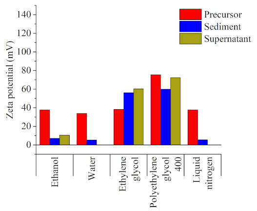 Zeta potential values for the precursor (the non-irradiated colloid of the carbonyl iron microparticles), the sediment, and the supernatant extracted from the irradiated samples, all dispersed in the corresponding solvents (ethanol was used in case of the samples prepared in liquid nitrogen).