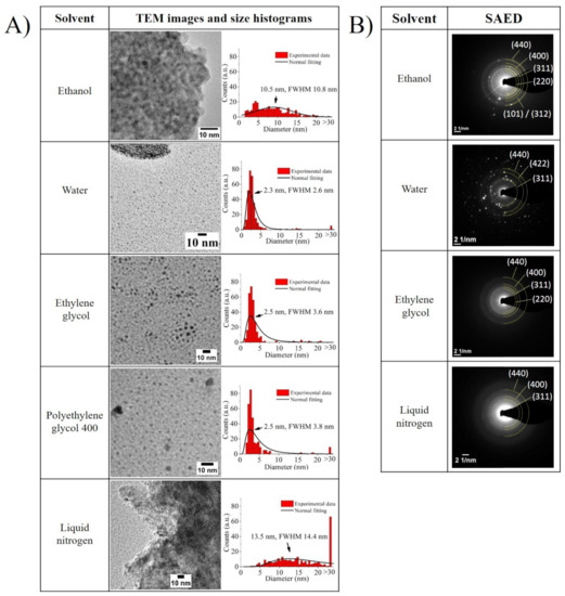 (A) Representative TEM images and size histogram of the different samples (obtained by counting 300 particles per each sample). The average size calculated from the normal fitting is indicated in the histograms. (B) SAED images of all samples (aside from polyethylene glycol 400). The d-spacings were assigned to the crystallographic families indicated in the Table S1 in the Supplementary Materials.