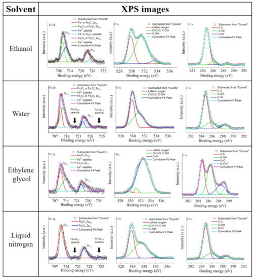 The peaks exhibited by the sample synthesized in water showed a certain similarity to those found in the liquid nitrogen sample. It is possible to see the Fe 2p peak at 710.5 eV, the Fe 2p at 723.8 eV, the satellites of FeO at 718.8 and 733.2 eV, and the peaks of Fe belonging to FeO at 712.1 eV and 725.6 eV. The combination of iron oxides may be due to the interaction between water in the gas state and the nucleating iron in the cavitation bubble or, alternatively, by their interaction with species coming from the laser-mediated molecular dissociation of water, which is rich in solvated electrons, hydroxyl radicals, and dissolved oxygen [50]. Unlike the case of liquid nitrogen, water is more viscous and, thus, can hold such species around the recently synthesized NPs, promoting the incomplete hydrogen reduction of the more thermodynamically stable FeO to FeO [51]. Finally, the lack of satellites for ethylene glycol points only to the presence of FeO. Although the graph included the Fe 2p peak at 710.6 eV, and a Fe 2p at 723.9 eV, which can be associated with both, FeO or FeO, the peaks of the Fe which belong just to FeO at 713.9 eV and 726.7 eV helped to address this ambiguity [48,49]. Similar to the case of water, the laser radiation could promote the molecular dissociation of ethylene glycol, which is also rich in solvated electrons, hydroxyl radicals, and dissolved oxygen [52]. However, unlike that case, ethylene glycol is more viscous and, therefore, can hold the species due to molecular dissociation around the nucleating Fe more effectively, leading to the preferential formation of FeO nanostructures.