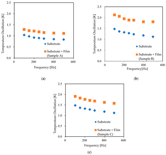 Temperature oscillation amplitude of (a) Sample A, (b) Sample B, and (c) Sample C at room temperature.