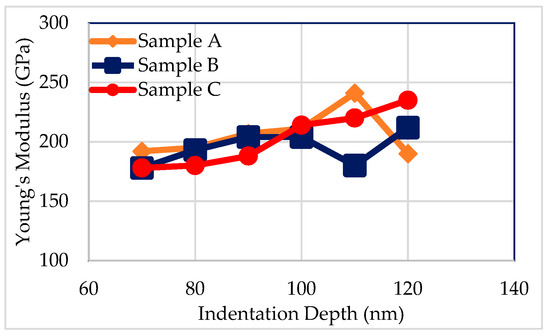 where E is Young’s modulus and is the film density. Film density may vary depending on film thickness or deposition condition, but it is negligible. The thermal conductivity is directly associated with the mean free path so that it is a very important parameter. Figure 6 shows the values of Young’s modulus, which is measured by the nanoindentation method at various indentation depths. Although it is not evident why the measured values increase with the indentation depth, the average Young’s modulus of the IGZO films can be determined around 200 GPa from a narrow plateau at the indentation depth of 100 nm. The Young’s modulus and the phonon velocity were constant across the sample. The density and specific heat capacity of the IGZO films were reported to be 5.86 g.cm−3 and 426 Jkg−1K−1 [32,37].