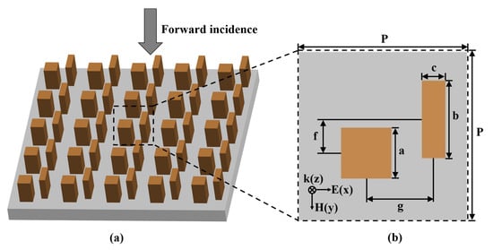 The schematic of the near-infrared bidirectional EIT metasurface is shown in Figure 1a, which is an a-Si cuboid-bar nanostructure periodic array on the SiO2 substrate. The unit cell of the periodic array, which comprises a cuboid resonator and a bar resonator, is shown in Figure 1b. The side length of the cuboid is a = 150 nm. The length and width of the bar is b = 230 nm and c = 70 nm, respectively. The height of the two resonators is h = 270 nm. The center distance between two resonators in x and y direction (along the short and long axis of the bar) is g and f, respectively. The period of unit cell in x and y direction is P = 500 nm. The refractive index of SiO2 is 1.528.