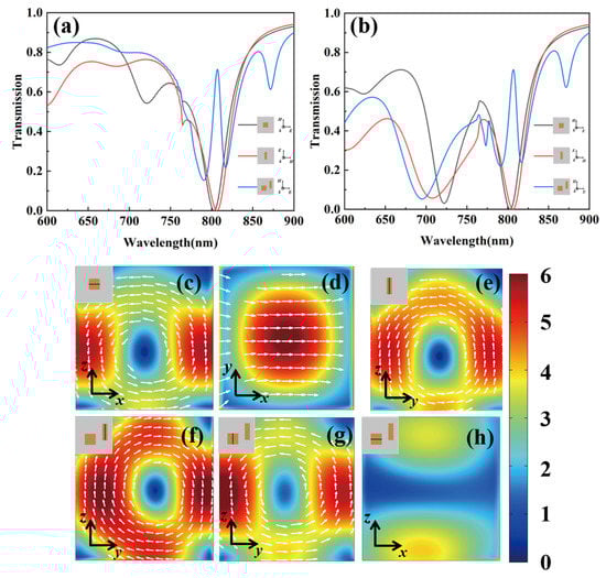 Transmission spectra for sole-cuboid nanostructure metasurface, sole-bar nanostructure metasurface and bidirectional EIT metasurface are simulated by FDTD Solutions. The simulated transmission spectrum of the sole-cuboid nanostructure metasurface with the incident electric field E along x axis exhibits a dip at 803 and at 722 nm under backward incidence, as shown by black curve in Figure 3b. At the transmission dip 803 nm, the enhanced circular electric field in the cuboid simulated by FDTD at the x-z plane corresponds to magnetic dipole resonance oriented in y direction, which forms the bright mode shown in Figure 3c. At the transmission dip 722 nm, the enhanced linear electric field in the cuboid simulated by FDTD at the x-y plane corresponds to electric dipole resonance oriented in x direction shown in Figure 3d. Under forward incidence, the dip at 803 nm remains unchangeable while the dip at 722 nm reduces significantly in the simulated transmission spectrum of sole-cuboid nanostructure metasurface shown by the black curve in Figure 3a, indicating that the magnetic dipole mode is bidirectional but the electric dipole mode is not. The scattering electric field induced by magnetic dipole is related to the permeability, which remains unchangeable under bidirectional incidence as the permeability is constant to 1 for both a-silicon metasurfaces and substrate. While, the scattering electric field induced by electric dipole is related to the permittivity, which changes with the direction of incidence as the permittivity distribution is different under forward incidence (incident from air side) and backward incidence (incident from substrate side). Due to the C4 symmetry of the cuboid, magnetic dipole resonance oriented in x direction is also excited by the E along y axis at 803 nm and cannot be excited by the x-polarized light directly, which serves as the dark mode under x-polarized incidence. In the simulated transmission spectrum of the sole-bar nanostructure metasurface with the incident electric field E along y axis under bidirectional incidence, a pronounced dip, as shown by red curve in Figure 3a,b, occurs at 806 nm, around which circular electric field at the y-z plane of the bar is simulated in Figure 3e, so a bidirectional magnetic dipole resonance in x direction forms and serves as the dark mode under x-polarized incidence. A transparency window centered at 809 nm is observed in the simulated transmission spectrum of the bidirectional EIT metasurface with the incident electric field E along x axis under bidirectional incidence, as shown by blue curve in Figure 3a,b. The simulated electric field distribution at the EIT peak inside the bar resonator and the cuboid resonator at the y-z plane both exhibit an enhanced loop, as shown in Figure 3f,g, respectively, whereas the circular electric field inside the cuboid resonator at the x-z plane vanishes, as shown in Figure 3h. Hence, the dark modes not only in the bar resonator but also in the cuboid resonator are excited simultaneously by the bright mode other than external electric field. When the structural asymmetry is introduced to the metasurface, the bright bidirectional magnetic dipole (MD) mode and dark bidirectional MD mode, arranged in close proximity in the special and frequency domain, interfere with each other destructively, suppressing the bright mode and consequently leading to the bidirectional EIT phenomenon.