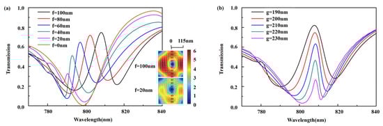 The transmission spectra of the cuboid-bar nanostructure EIT metasurface are simulated by FDTD Solutions with vertical spacing f and horizontal spacing g. The simulated transmission spectra of EIT metasurface with different vertical spacing f are shown in Figure 5a, where the EIT peak increases and red-shifts with vertical spacing f varying from 0 to 100 nm. When f equals to 0, the EIT phenomenon vanishes and only the MD resonance dip remains in the simulated transmission spectrum. Increasing structural asymmetry f will enhance the coupling effect between the cuboid and bar, and change the spatial location of the center of the circular displacement currents inside the bar, shown by inset in Figure 5a, resulting in red-shift of the dark modes and consequently shift and enhancement of the EIT peak. The simulated transmission spectra of EIT metasurface with horizontal spacing g are shown in Figure 5b. When the horizontal spacing g increases from 190 to 230 nm, the EIT peak increases and broadens with the spectral position fixed at 809 nm as a result of enhancement of coupling among the magnetic dipoles in cuboid and bar.