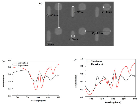 Scanning electron microscopy (SEM) image of the fabricated sample is shown in Figure 6a. The size of the cuboid and bar is close to 150 nm × 150 nm, 230 nm × 70 nm, respectively. Period of the cuboid-bar array nanostructure is Px ≈ 500 nm, Py ≈ 500 nm. The total area of the fabricated sample is 300 μm × 300 μm. The measured transmission spectra of the fabricated EIT metasurface exhibit a bidirectional EIT peak with a maximum of 65% and a maximum of 63% at 806 nm under forward and backward incidence, respectively, shown by black curve in Figure 6b,c. The experimental spectra are in the same trend with the simulated results shown by red curve in Figure 6b,c, despite that the EIT peak in the measured spectra is reduced and broadened, which arises from the imperfection of the fabricated EIT metasurfaces and the formation of a low refractive index oxide layer. The correlation coefficient between the experimental and simulated EIT peak reaches 0.73 and 0.78 under forward and backward incidence, respectively, which demonstrates the good matching between the measured and simulated EIT peak.