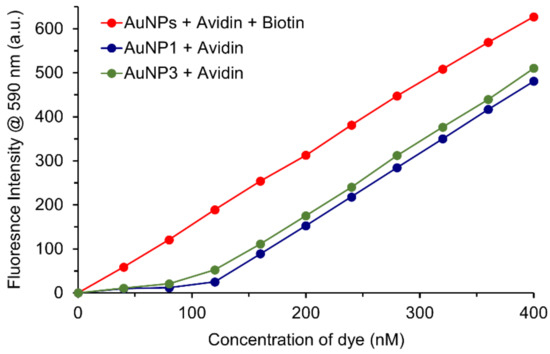 In order to assess the number of proteins bound to each AuNP, we performed fluorescence titration experiments using AuNP1 and AuNP3 and the biotinylated dye Atto565 (Figure 2). We have chosen this dye, which is characterized by λex = 565 nm and λem = 590 nm, because these two wavelengths are off the absorbance regions of the AuNPs and no interference was observed also with their SPR band. Notably, we could not use the typical absorbance-based protocol that takes advantage of the change of absorbance of the dye 4’-hydroxyazobenzene-2-carboxylic acid (HABA) because when it is bound to the protein it absorbs at 500 nm, too close to the maximum of the SPR band of the nanoparticles [31]. The florescence experiments rely on the well-known quenching of the fluorescence of molecules when in close proximity to a gold nanoparticle [32]. The nanoparticles were first pre-saturated with avidin and the excess of the protein was removed. Subsequently, we added to the AuNPs solution incremental amounts of the dye. No increase of fluorescence was observed at the beginning because of its quenching due to the binding of the dye to the avidin saturating the nanoparticle surface. This process occurs at the binding sites present on the opposite facet of the protein with respect to those already bound to the biotinylated nanoparticle. Afterwards the fluorescence intensity increased linearly, indicating the dye was no longer able to bind to the nanoparticles and was free in solution. Intersection between these two lines allowed us to determine the saturation concentration of the dye, equivalent to the concentration of free binding sites of the protein (Figure 3). As a control, to rule out non-specific binding events we carried out the experiment after saturation of the binding sites of avidin with an excess of biotin. In that case we expected to observe no quenching of the biotinylated fluorophore and only a linear increase of the fluorescence intensity as was indeed the case (Figure 3).