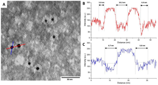 (A) TEM image of AuNP2 fully passivated with avidin stained with uranyl acetate. The protein corona is clearly visible as a lighter ring surrounding the dark nanoparticles. (B,C) Color intensity analysis across the red (B) and blue (C) lines of TEM image on the left.
