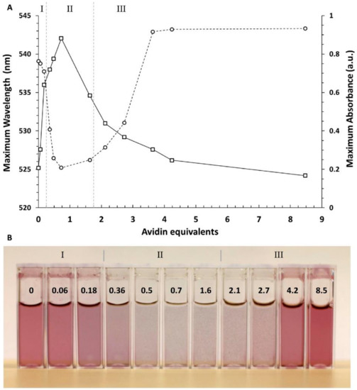 One of the most studied aspects of the interaction between biotinylated nanoparticles and avidin (or streptavidin) is the possibility to modulate the interaction between the nanoparticles in a controlled way [14,35]. The aggregates formed depend strongly on the relative ratio between the protein and the biotin units present on the surface of the nanoparticles. Having assessed with precision not only the number of avidin units present on the AuNPs surface, but also the exact number actually taking part in the binding process, we are in the unique position of precisely controlling this ratio. We are not discovering anything new but simply determining with unprecedented precision how the relative amount of protein affects aggregation. AuNPs of the size we are using in this work allow to follow the aggregation processes spectrophotometrically because the SPR band is not only sensitive to the interaction with the protein but also to the occurrence of aggregation phenomena. Figure 5A reports the dependence of the position of the SPR band and its intensity from the number of equivalents of avidin added to the solution of biotinylated AuNPs. These values represent the maximum of the bands resulting from the summation of the contribution of the SPR band of the isolated nanoparticles and that of the aggregated ones (when present). The spectrum of each sample is reported in Figure S16. One equivalent represents the amount of avidin required to fully saturate its four binding sites, considering only the percentage of biotin units on the surface of the nanoparticles available for binding. Each point in this graph represents an independent experiment since a regular titration cannot be performed. In fact, once the specific equilibrium related to the given amount of avidin added is reached, the shift towards a new equilibrium is a very long process that may require several days. The graph can be divided into three regions (vertical dashed lines of Figure 5A). Region I correspond to a situation in which very little amount of protein has been added (well below one equivalent). Region II corresponds to additions around the stoichiometric amount of protein, while Region III corresponds to the addition of an excess of it. Figure 5B reports the picture of the solutions corresponding to different equivalents of avidin added. The faded color of cuvettes 5–8 is the result of precipitation due to extensive avidin-mediated crosslinking of the nanoparticles resulting in the formation of large aggregates (see Figure S17 for comparison when allowed to deposit).