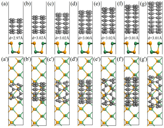 Optimized structures of different CNTs on monolayer GeSe: (a–g) and (a′–g′) are side and top view of (n,0) CNTs/GeSe (n = 5–11), respectively. d is the equilibrium spacing between the top Se atomic layer and the annotated wall. Gray, orange, and green spheres represent C, Se, and Ge atoms, respectively.