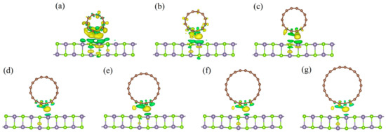 Charge density differences for CNT(n,0)/GeSe with n = (a) 5, (b) 6, (c) 7, (d) 8, (e) 9, (f) 10, and (g) 11. The isovalue is set to 0.0015 e/Å3. The yellow and green regions represent charge loss and gain of electrons, respectively.
