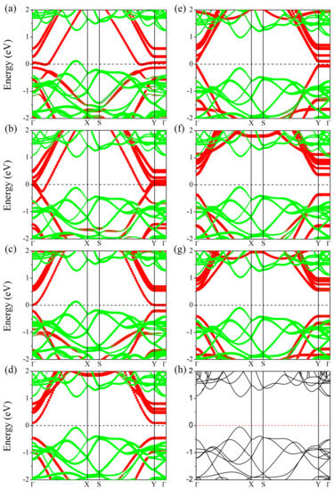 Projected band structures of (n,0)CNT/GeSe hybrids with n = (a) 5, (b) 6, (c) 7, (d) 8, (e) 9, (f) 10, and (g) 11. The red and green circle size denotes the weight of the CNT and monolayer GeSe in the CNT/GeSe configuration band structure. (h) is the band structure of pristine 2D GeSe calculated for comparison. A horizontal dashed line represents the Fermi level.