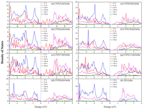 PDOS of CNT(n,0)/GeSe hybrids with n = (a) 5, (b) 6, (c) 7, (d) 8, (e) 9, (f) 10, (g) 11, and a (h) monolayer GeSe. The Fermi level is set to zero.