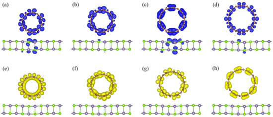 In Figure 5, we show the partial DOS (PDOS) of (n,0)CNT/GeSe (n = 5–11) and monolayer GeSe. Compared with the PDOS of monolayer GeSe, the PDOS of GeSe in the heterojunction is the same as that of the monolayer GeSe. The total DOS of the CNT/GeSe heterojunction can be viewed as a superposition of the DOS in the CNT and in the 2D GeSe. This further proves that there is a weak vdW interaction between the CNTs and 2D GeSe. From the perspective of the PDOS, the conduction band near the Fermi surface of the CNT/GeSe heterojunction is provided by the CNT and GeSe together. In contrast, the valence band is mainly provided by the 2p orbital of carbon atoms. Aside from the 2p orbital of carbon atoms, the orbital DOS of the other elements is unchanged. It is the 2p orbital of carbon that determines the top position of the valence bands, thus, affecting the band structure of the heterojunction. As shown in Figure 5a–c, the 2p orbital of carbon in (n,0)CNT/GeSe (n = 5–7) passes through the Fermi level, so those heterojunctions are metallic. The 2p orbital of carbon in (8,0)CNT/GeSe and (9,0)CNT/GeSe is closer to the Fermi surface than that in the (10,0)CNT/GeSe and (11,0)CNT/GeSe heterojunctions, which leads to smaller bandgaps in (8,0)CNT/GeSe and (9,0)CNT/GeSe heterojunctions than those in (10,0)CNT/GeSe and (11,0)CNT/GeSe heterojunctions.