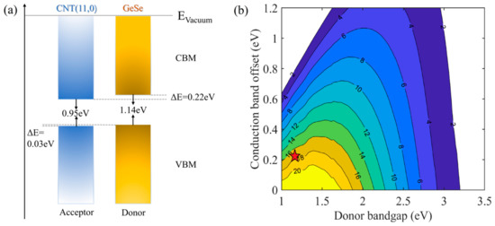 where the fill factor () is 0.65. The maximum open-circuit voltage ( is estimated by , where is the donor bandgap. is the conduction band offset (CBO) between the donor (GeSe) and acceptor (CNT). is the AM1.5 solar energy flux at the photon energy (). The integral in the numerator is the short circuit current () performed by applying an external quantum efficiency limit of 100%, and the integral in the denominator in Equation (4) is the incident solar radiation (= 1000 Wm−2). As mentioned in our analysis of the band structure, the donor layer is the GeSe monolayer with a bandgap of 1.14 eV, while the value of the CBO in the (10,0)CNT/GeSe heterostructure is 0.48 eV. We found that the PCE of the (10,0)CNT/GeSe heterostructure reaches 11.04% following the calculated definition. To achieve a higher PCE by combining CNTs and GeSe, we further obtain the optimized structure of (11,0)/GeSe and the corresponding band structure using the same simulation method. As shown in Figure 8, the (11,0)CNT/GeSe heterostructure has type-II band alignment. The type-II heterostructure facilitates the separation of photogenerated carriers and holes. The value of the CBO in the (11,0)CNT/GeSe heterostructure is 0.22 eV. The PCE of the (11,0)CNT/GeSe heterostructure reaches 17.29%. The obtained high PCE in the (11,0)CNT/GeSe heterostructure is comparable to that in bilayer phosphorene/MoS2 (16%–18%) [45] and GeSe/SnS (18%) [46] heterostructures.