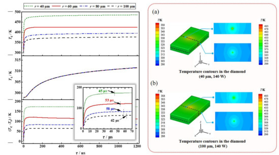 Temperature variation of diamond with different thermal radius in the heating process (top: center, middle: upper surface, and bottom: the difference). Inset: the temperature contours in the diamond with the absorbed power of 140 W and heat source radius of (a) 40 μm, and (b) 100 μm, respectively.