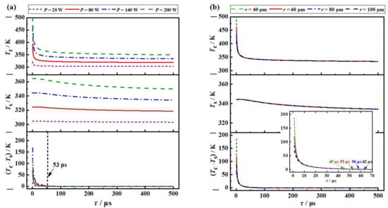 To understand the maximum repetition rate of DRL under quasi-continuous pumping conditions, the temperature variation in a diamond is calculated after the heat source is removed, when the thermal steady-state is realized. Figure 4a,b shows the cooling process of the diamond after thermal state-stability is reached, when the radii of the heat source and the absorbed power are constant (refer to Figure 2 and Figure 3), respectively, where the steady-state temperature distributions in the diamond crystal under various pump beams with different waist radii and different heat sources powers are regarded as the corresponding initial state. For the reason discussed above, we still pay more attention to the evolution of the temperature gradient in the diamond crystal. Figure 4a indicates that temperature gradient drops to 1% of the values of the initial state (approaching 0 K) after the laser stops working for 53 μs for the cases with different heat source powers, corresponding to their thermal constant times. This means that the temperature-gradient-driven thermal effects in the external-cavity DRL under a pump beam with a waist radius of 60 μm almost disappear after 53 μs. Similarly, for the cooling process with different waist radii, as illustrated in Figure 4b, it takes the same time as their respective “thermal constant time” for the temperature gradients to drop to 1% of their respective initial state values in different cases.