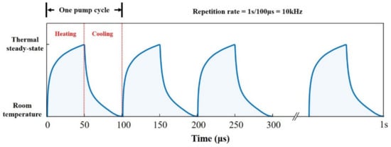 In summary, thanks to the extremely high thermal conductivity of the diamond, the thermal constant time in the DRL is quite short, ranging from 45 to 60 μs in typical application conditions. The waist radius is the most important factor to determine the thermal constant time of diamond, and the pump beam power has no effect on this. As illustrated in Figure 5, the diamond reaches the thermal steady-state after 50 μs pumping (heating period); once the pump stops, the temperature of diamond drops to room temperature after 50 μs (cooling period). It can be concluded that, for a single-sided cooled diamond crystal as the gain medium, long-term kW-level Raman lasing without heat accumulation can be realized at a repetition rate of up to 10 kHz.