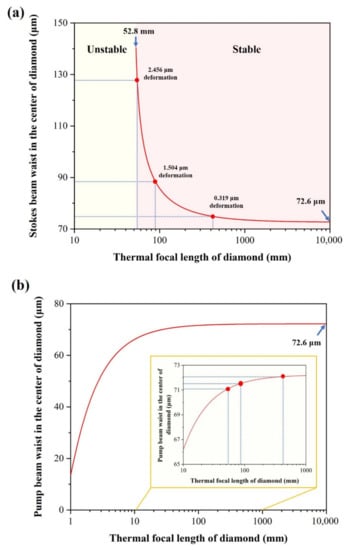 To further study the influence of the thermal effect on the cavity mode, we calculated the influence of the thermal lens effect’s strength on the intracavity Stokes mode. According to the schematic diagram in Figure 1, the cold cavity length is set as 201 mm, which corresponds to the Stokes beam waist radius of 72.6 μm. As can be seen from Figure 7a, the increased thermal-induced deformation will cause a stronger thermal lensing effect (corresponding to shorter f), which leads to an increase in the Stokes beam radius in the center of the diamond, and then to an increased lasing threshold. When the thermal lens effect is intensified further (f < 52.8 mm), the resonator will become unstable. In contrast, the radius of pump beam in the center of the diamond is slightly inversely proportional to the intensity of the thermal effect. However, neither of the above conditions poses any significant challenge to the generation of highly efficient diamond Raman lasing. For example, when f = 54.5 (2.5 μm deformation), we need to increase the cavity length from 201 mm to ~204.4 mm to keep the radius of the pump and Stokes constant (~72.6 μm). Moreover, the waist radius of the Stokes beam is usually set to be no smaller than that of the pump beam for high-quality Raman lasing; therefore, the simulation results also indicate that the output Stokes can still maintain high quality, even in the presence of thermal effects.