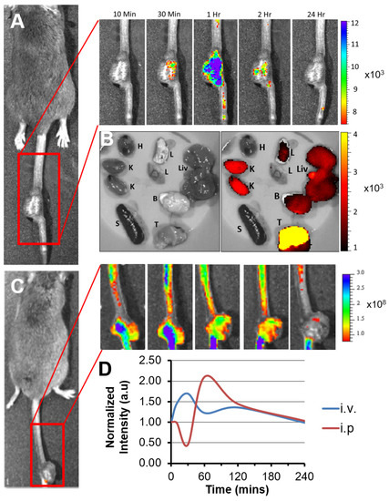Recently, we reported a peptide(p5RHH)-based nucleic acids delivery platform, which protects nucleotides from serum degradation with circulation t1/2 ≈ 159 min [43], enables cytoplasmic delivery through endosomal escape via its pH sensing capability [52], and exhibits a benign safety profile without alteration of systemic innate or adaptive immunoresponsiveness, or cardiac toxicity [43,47,51]. In a previous in vitro study [52], we demonstrated that the p5RHH-based delivery platform is capable of specific inhibition of both canonical and noncanonical NF-κB signaling pathways in transformed F8 lymphoma cells [56] using simultaneously delivery of both p65 and p100 siRNAs. To determine if p5RHH-based nucleic acids delivery platform is capable of delivering siRNA to tumors in vivo after systemic administration, TAX-LUC mice (n = 4) received intraperitoneal or intravenous administration of p5RHH-based nanoparticles loaded with Cy5.5-conjugated siRNA. A time course of fluorescent images of TAX-LUC mice demonstrated rapid uptake of siRNA in tumors (Figure 1). Delivery kinetics after intraperitoneal administration peaked at 60 min post injection (Figure 1A,D), whereas intravenous administration of p5RHH-Cy5.5siRNA nanoparticles resulted in more rapid distribution of fluorescence, peaking around 30 min post injection (Figure 1C,D). Both routes of administration consistently delivered siRNA to tumors in vivo, likely due to leaky vasculature in the tumor through the endothelial permeability and retention (“EPR”) effect (Figure 1B). Moreover, the prominent siRNA signal detected in tumor, the high signals in kidney are consistent with our previous publications that major clearance route of this nanoparticle is kidney [51]. We also detected some siRNA signal in the liver, lung, and brain, which may be due to lymphoma associated inflammation in central nervous system [57,58,59,60,61] and other organs. Because our previous studies have shown that this delivery system spares health brain [45], lung [50], and other organs/tissues, and is not cleared appreciably by a healthy liver [51], the present results support the observation that this nanomaterial permeates leaky vasculature associated with tumoral and inflammatory microenvironment.